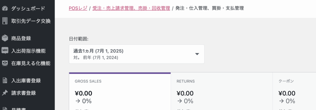・決済(POSレジ、券売機システム、多通貨対応)、発注・仕入管理、買掛・支払管理、受注・売上請求管理、売掛・回收管理のスクリーンショット